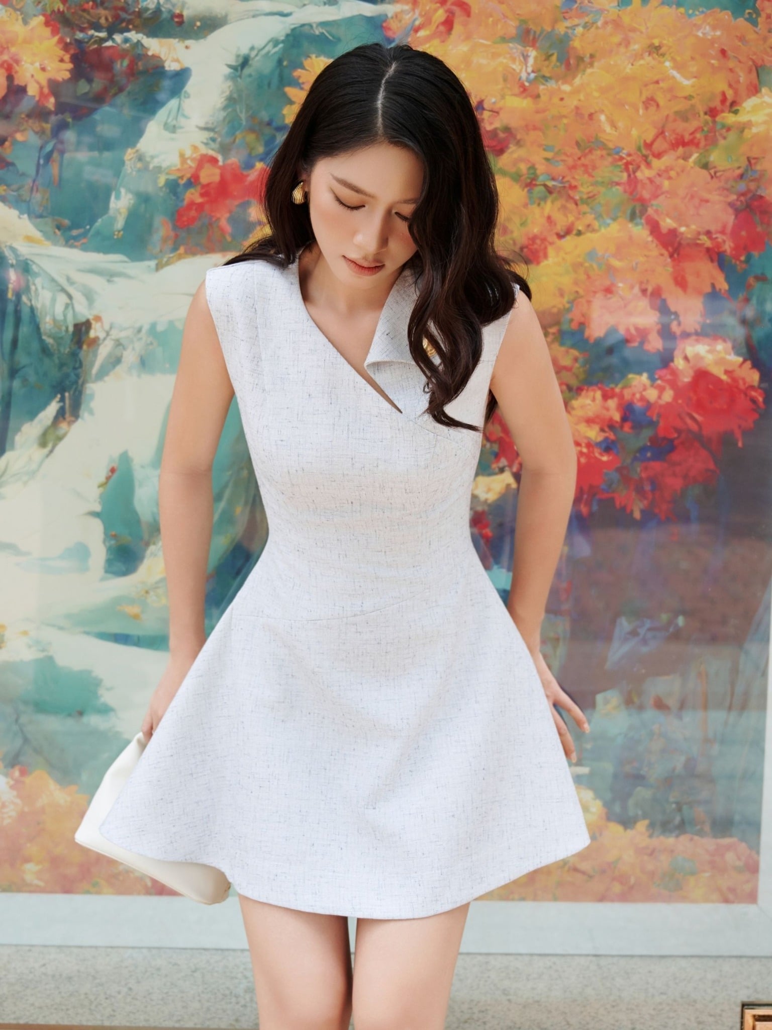- Đặc điểm nổi bật: Đầm form A, Cổ lật qua 1 bên cố định