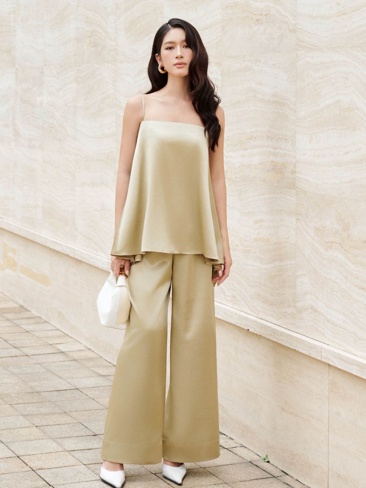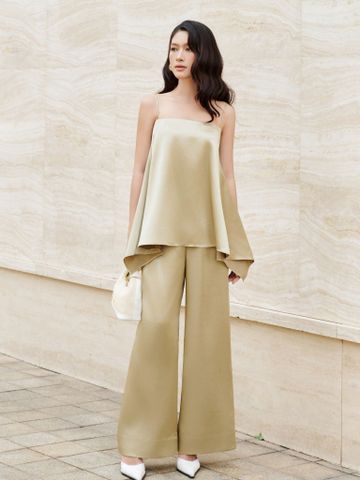 - Đặc điểm nổi bật: - Áo cúp ngực basic, form ôm ngực xoè rộng eo, sau lưng có nút / - Quần tây dài, ống suông vừa, dây kéo phía trước