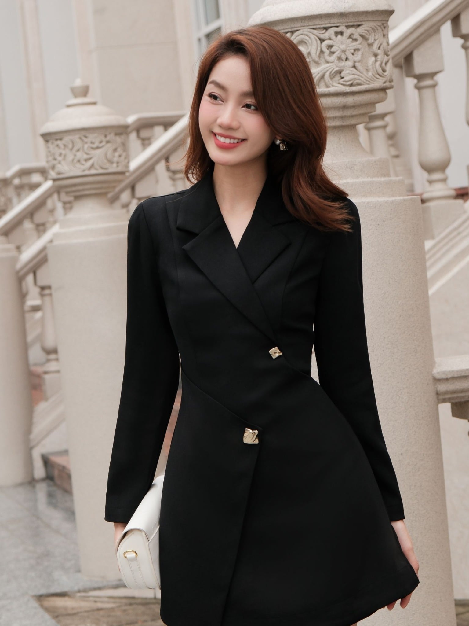 - Đặc điểm nổi bật: Đầm mini form vest tay dài tùng A nhẹ có tà đắp từ sườn đính buckle kim loại màu vàng
