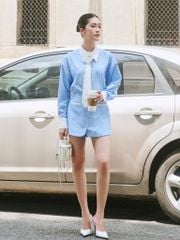 - Đặc điểm nổi bật: Áo sơ mi form rộng/ - Hoa dính kèm caravat, carvat tháo rời/ - Chân váy có quần là vải sọc chính bên ngoài, ủi keo chắc chắn.