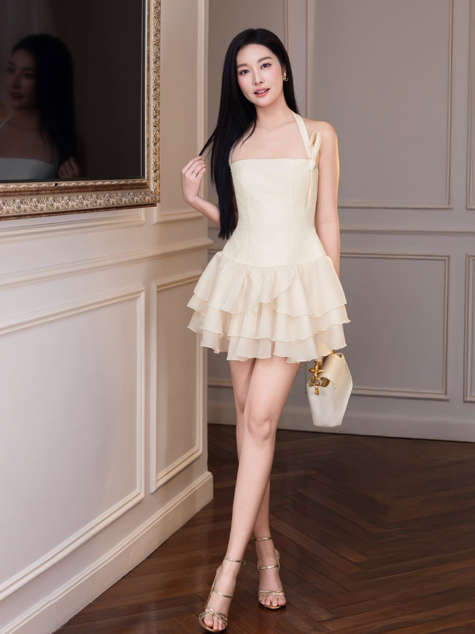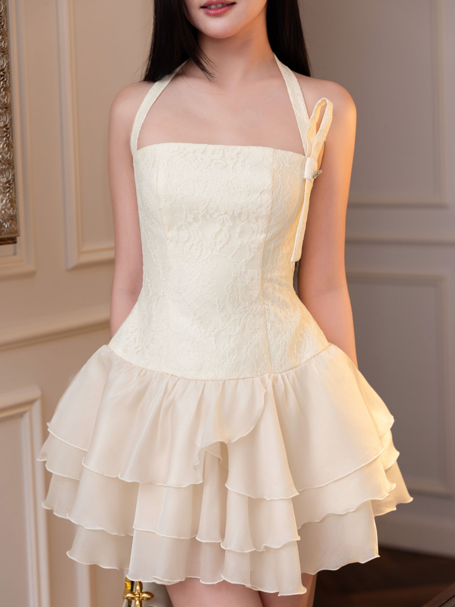 - Đặc điểm nổi bật: Đầm cúp ngang ngực/ - Hai dây quàng xéo dô cổ, có nút cài phía sau/ - Form ôm xệ eo, phối bèo Voan điệu