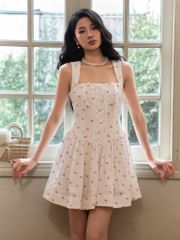 - Đặc điểm nổi bật: Đầm 2 dây bảng to, nhún xoè, dáng corset tôn dáng