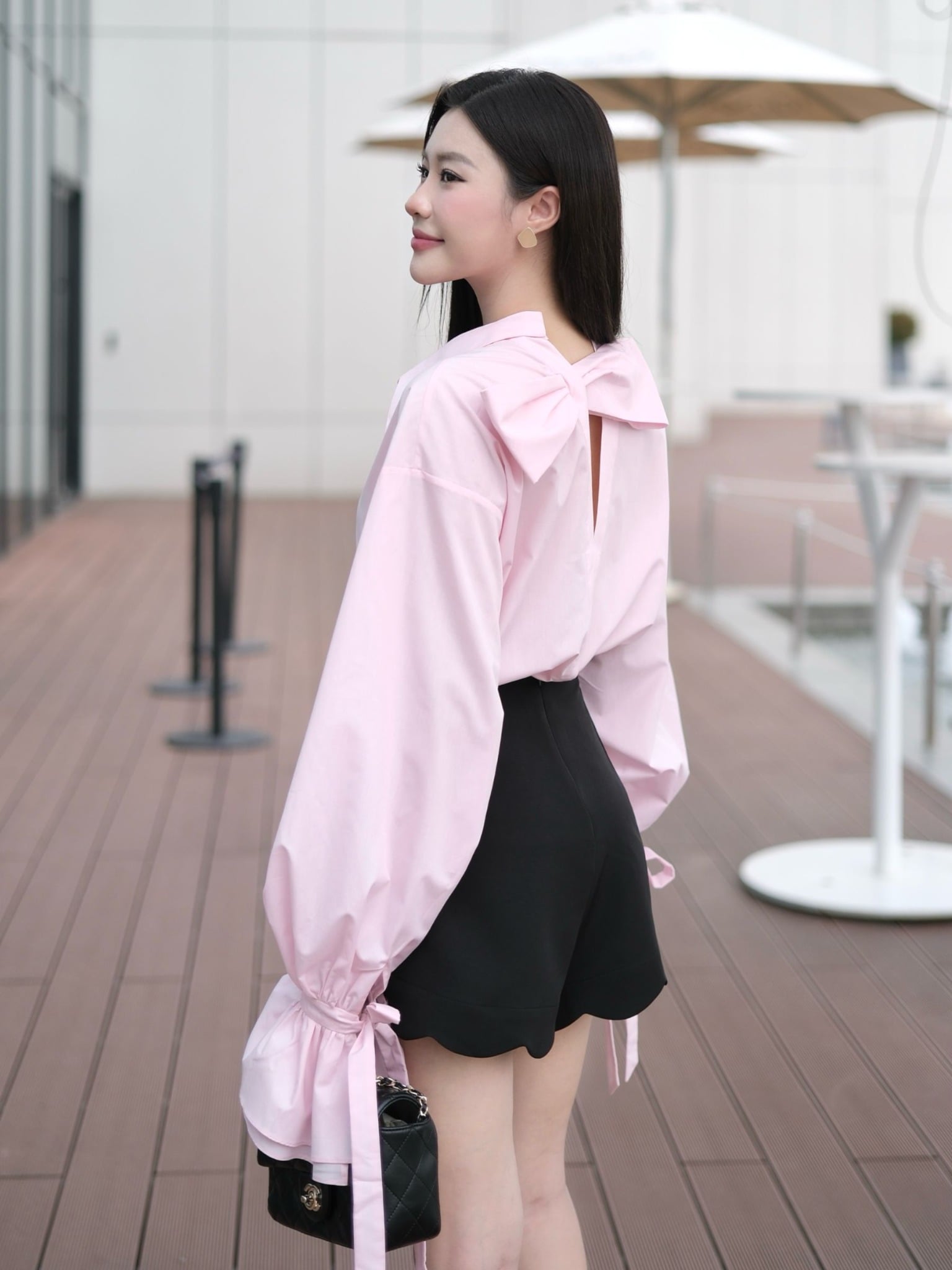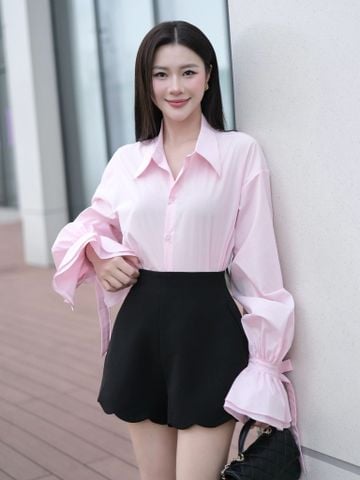 - Đặc điểm nổi bật: Áo sơ mi form rộng/ - Phần lưng sau có hở V phối nơ đính cố định