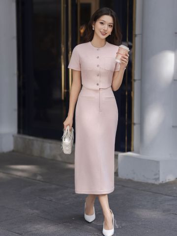 - Đặc điểm nổi bật: Áo form crotop vừa người cổ tròn tay ngắn có 2 túi đáp trên ngực/ - Chân váy bút chì có 2 túi cơi thân trước