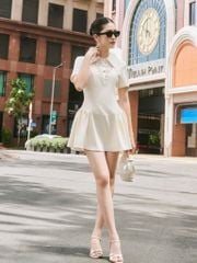 - Đặc điểm nổi bật: Đầm form ôm xệ eo, tùng xòe 2 bên hông/ - Phần cổ & Ngực có phối voan