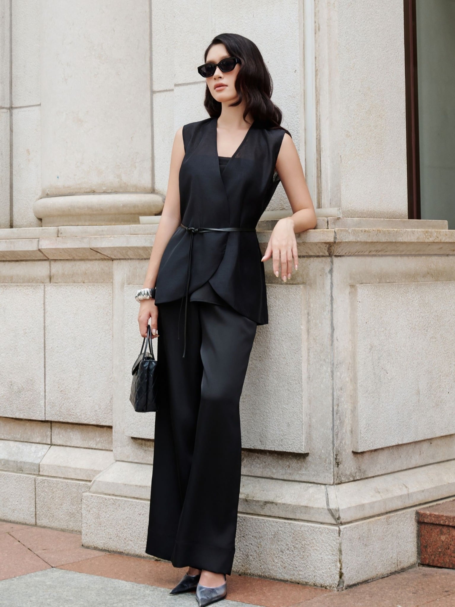 - Đặc điểm nổi bật: Áo cúp ngực basic, ôm eo, dây kéo sau lưng/- Quần tây dài, ống suông vừa, dây kéo phía trước