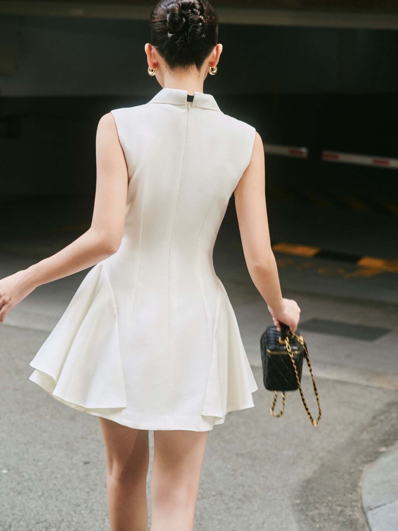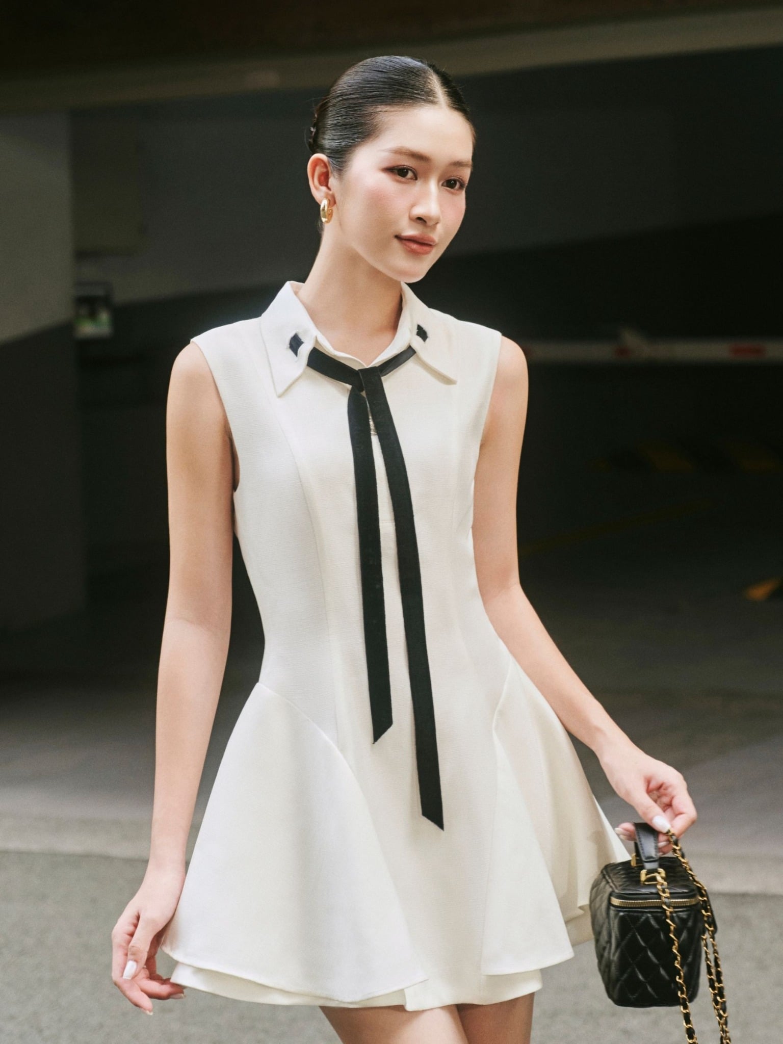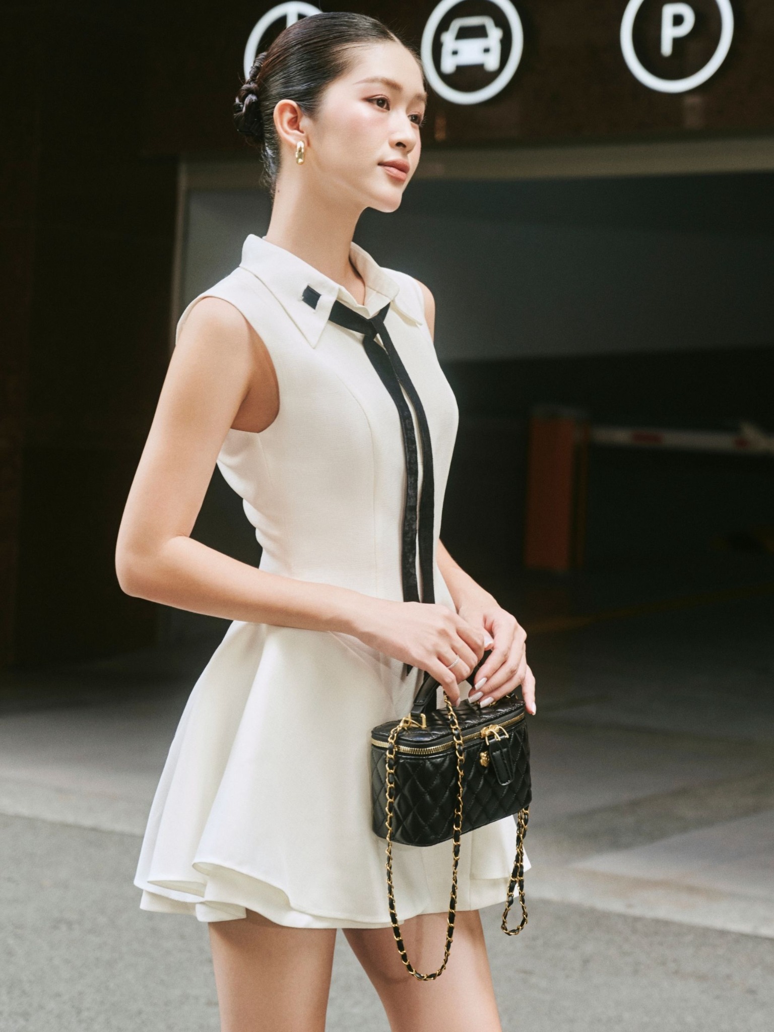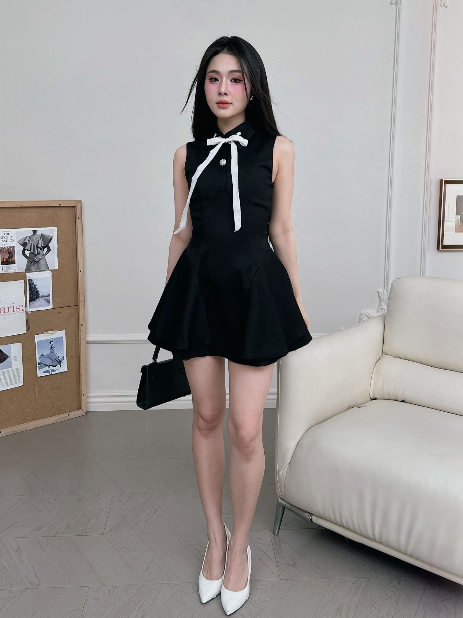 - Đặc điểm nổi bật: Đầm sát nách form ôm, tùng xòe đổ/ - Phần dây có thể tháo rời/ - Điểm nhấn ngay khuy cổ là nút hoa đá điệu
