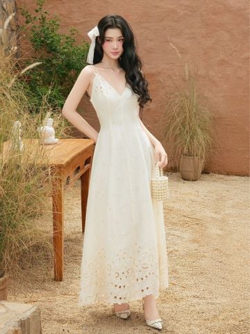 - Đặc điểm nổi bật: Đầm dài cổ V form ôm thùng xòe đổ/ - Điểm nhấn trên đầm là phần lai có hoa cách điệu của vải/ -Phần dây xoắn cố định