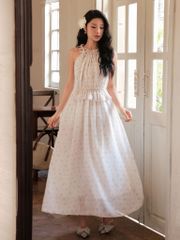 - Đặc điểm nổi bật: Đầm cổ yếm nhún cổ và eo./ -Phần tùng xòe ngay eo tạo điểm nhấn cho đầm thêm điệu đà, tiểu thư